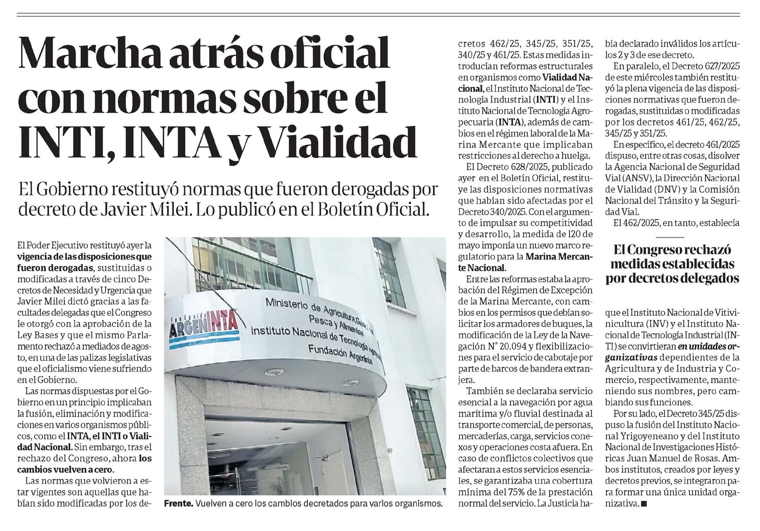 CLARÍN – Marcha atrás oficial con normas sobre el INTL, INTA y Vialidad