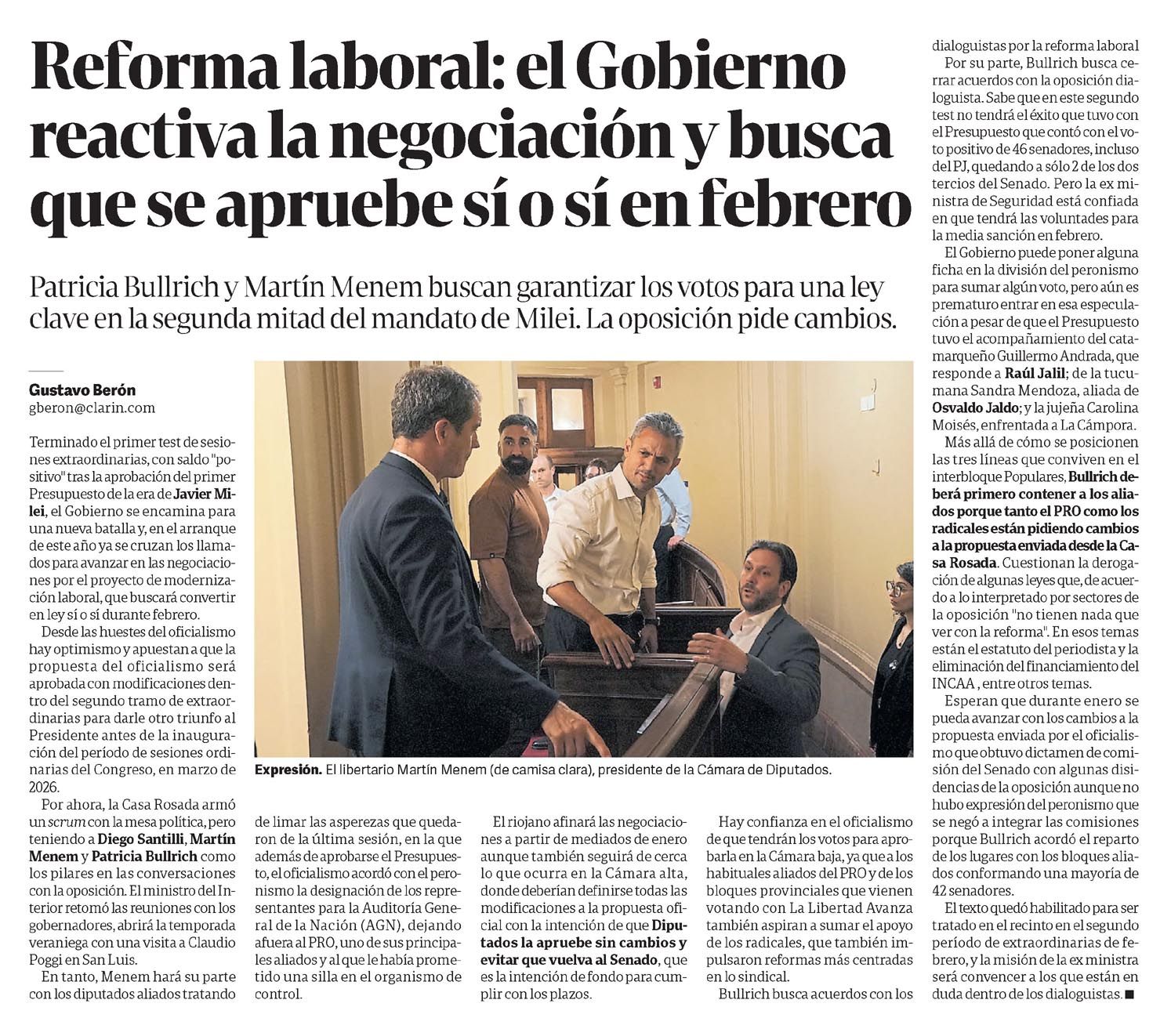 CLARÍN – Reforma laboral: el Gobierno reactiva la negociación y busca que se apruebe sí o sí en febrero