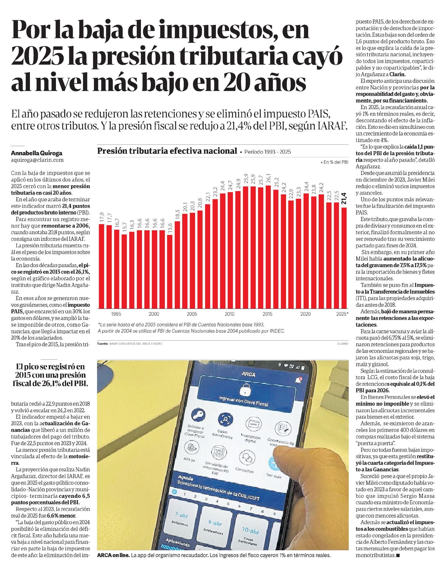 CLARÍN – Por la baja de impuestos, en 2025 la presión tributaria cayó al nivel más bajo en 20 años