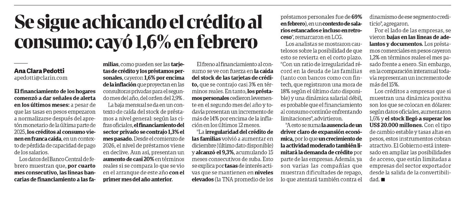CLARÍN – Se sigue achicando el crédito al consumo: cayó 1,6% en febrero