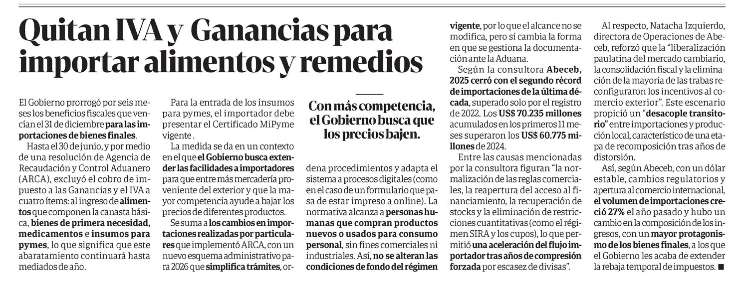 El Gobierno prorrogó por seis meses los beneficios fiscales que vencían el 31 de diciembre para las importaciones de bienes finales. Hasta el 30 de junio, y por medio de una resolución de Agencia de Recaudación y Control Aduanero (ARCA), excluyó el cobro de impuesto a las Ganancias y el IVA a cuatro ítems: al ingreso de alimentos que componen la canasta básica, bienes de primera necesidad, medicamentos e insumos para pymes, lo que significa que este abaratamiento continuará hasta mediados de año.
