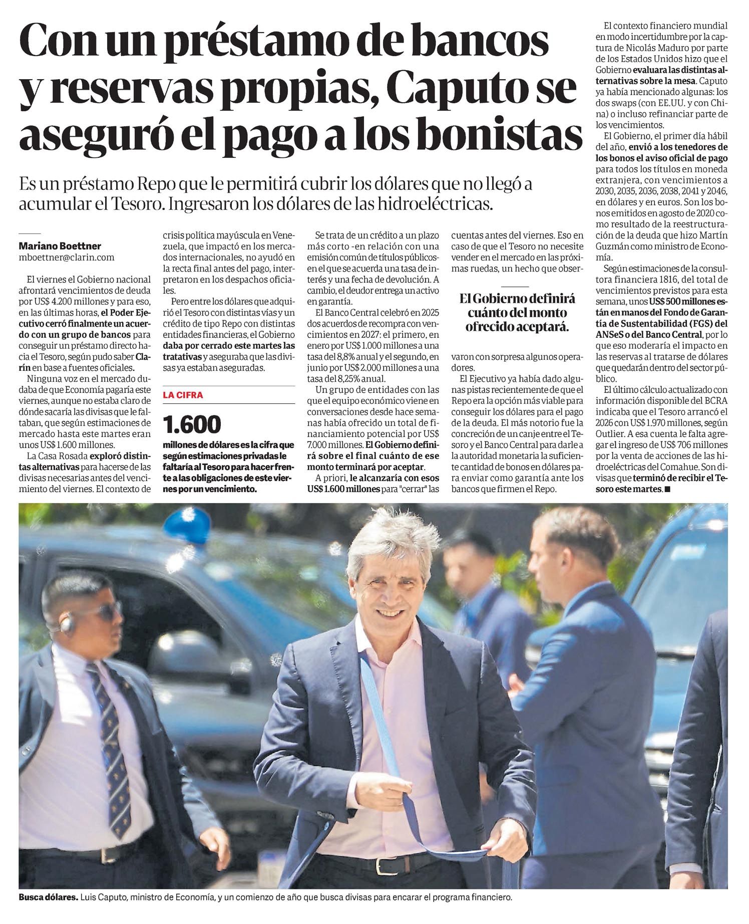 CLARÍN – Con un préstamo de bancos y reservas propias, Caputo se aseguró el pago a los bonistas