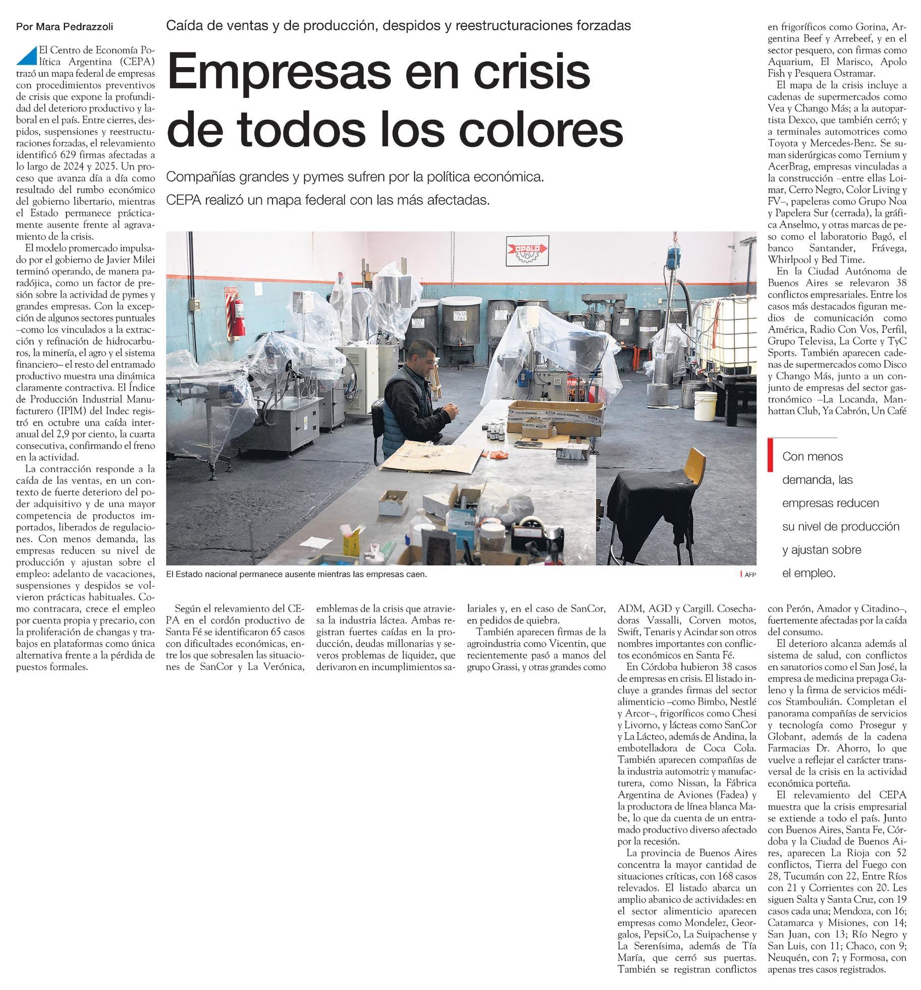 El Centro de Economía Política Argentina (CEPA) trazó un mapa federal de empresas con procedimientos preventivos de crisis que expone la profundidad del deterioro productivo y laboral en el país. Entre cierres, despidos, suspensiones y reestructuraciones forzadas, el relevamiento identificó 629 firmas afectadas a lo largo de 2024 y 2025. Un proceso que avanza día a día como resultado del rumbo económico del gobierno libertario, mientras el Estado permanece prácticamente ausente frente al agravamiento de la crisis.