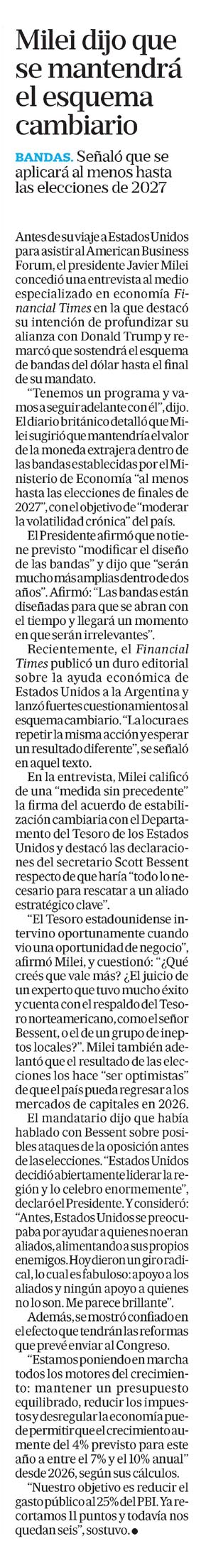 BANDAS. Señaló que se aplicará al menos hasta las elecciones de 2027. Antes de su viaje a Estados Unidos para asistir al American Business Forum, el presidente Javier Milei concedió una entrevista al medio especializado en economía Financial Times en la que destacó su intención de profundizar su alianza con Donald Trump y remarcó que sostendrá el esquema de bandas del dólar hasta el final de su mandato.