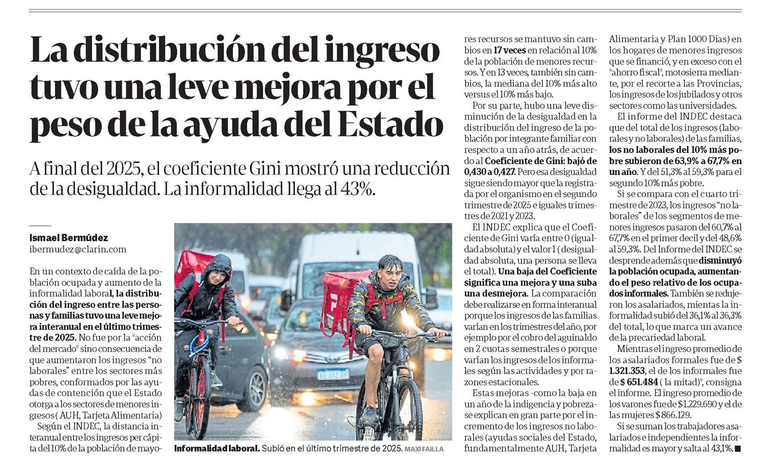 CLARÍN – La distribución del ingreso tuvo una leve mejora por el peso de la ayuda del Estado