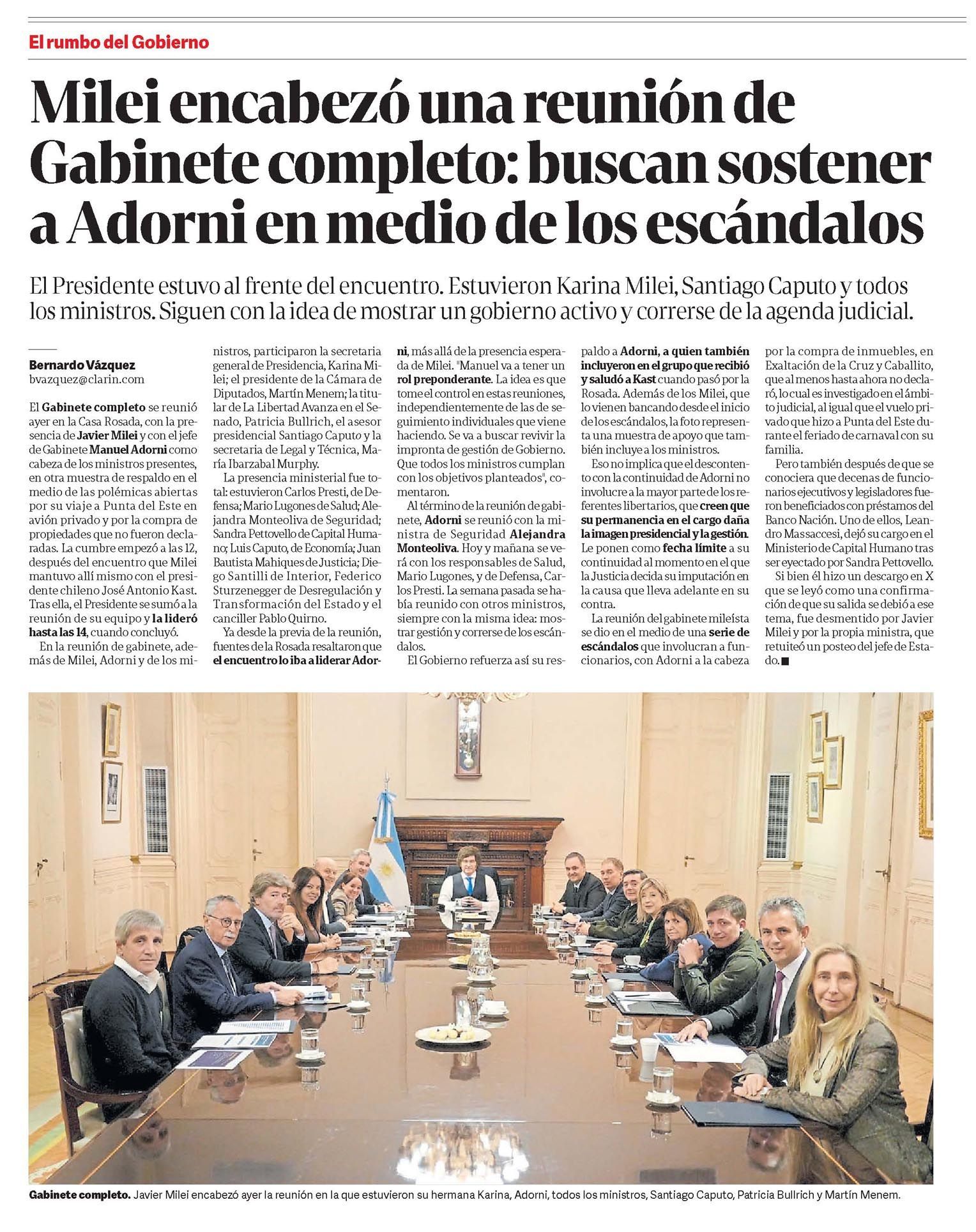 El Presidente estuvo al frente del encuentro. Estuvieron Karina Milei, Santiago Caputo y todos los ministros. Siguen con la idea de mostrar un gobierno activo y correrse de la agenda judicial.