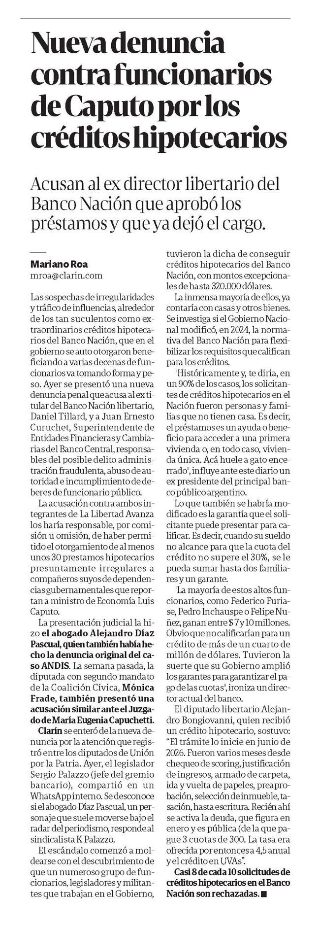 CLARÍN – Nueva denuncia contra funcionarios de Caputo por los créditos hipotecarios