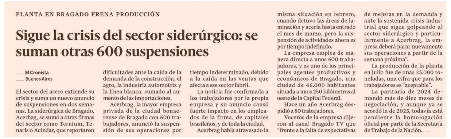 EL CRONISTA – Sigue la crisis del sector siderúrgico: se suman otras 600 suspensiones