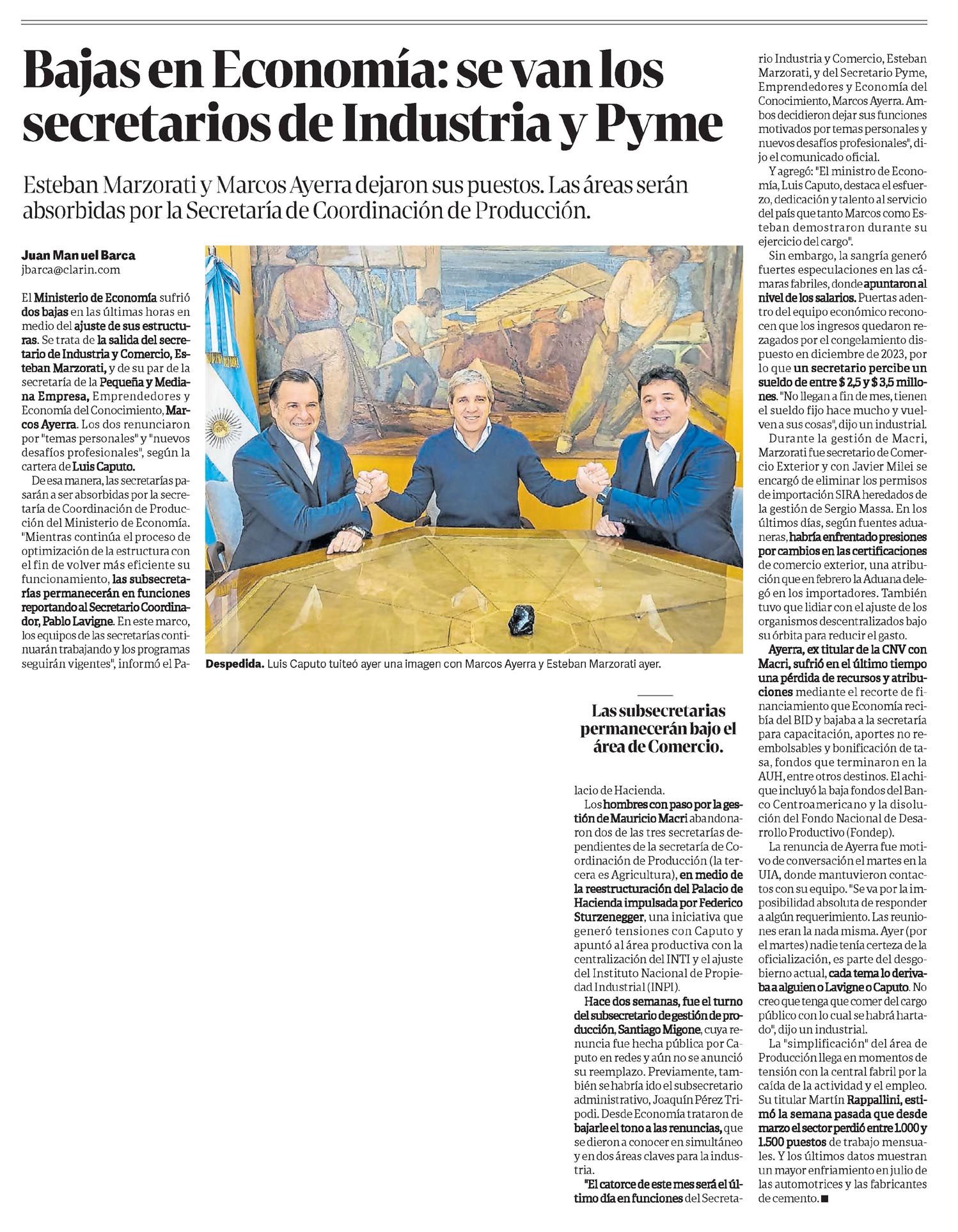 CLARÍN – Bajas en Economía: se van los secretarios de Industria y Pyme