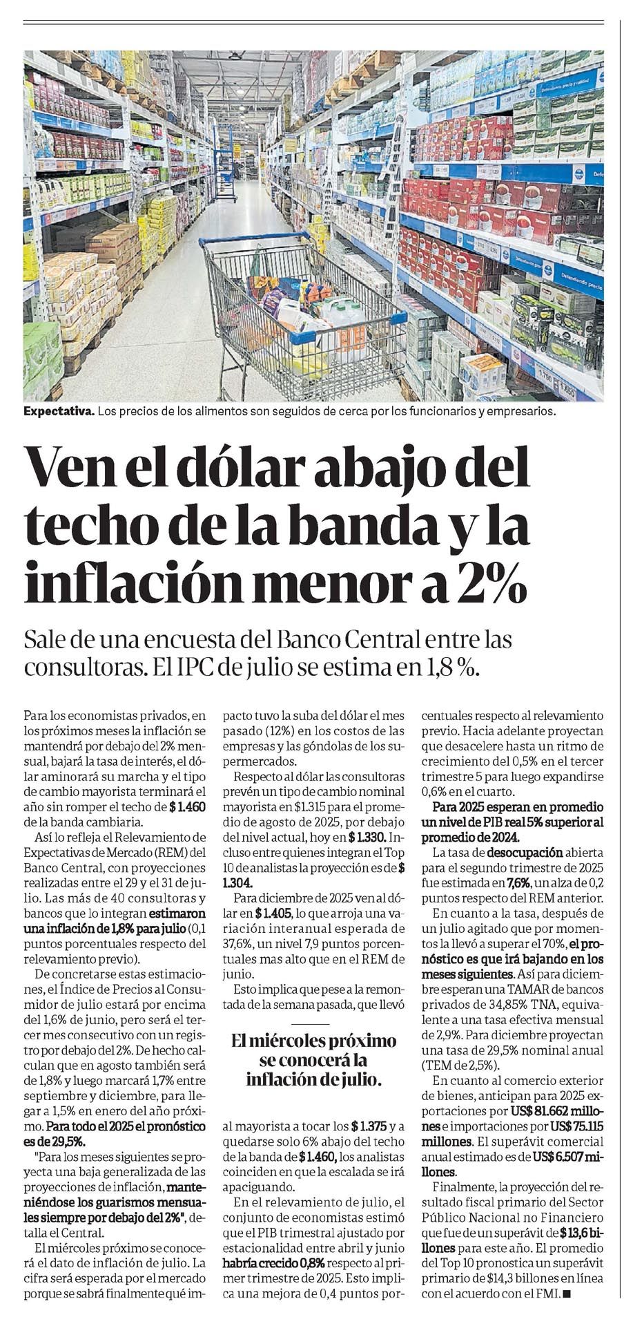 CLARÍN – Ven el dólar abajo del techo de la banda y la inflación menor a 2%