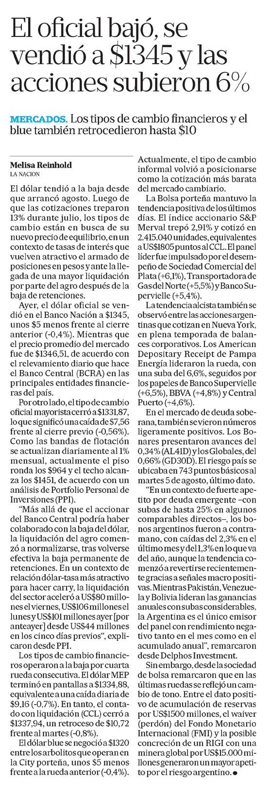 LA NACIÓN – El oficial bajó, se vendió a $1345 y las acciones subieron 6%