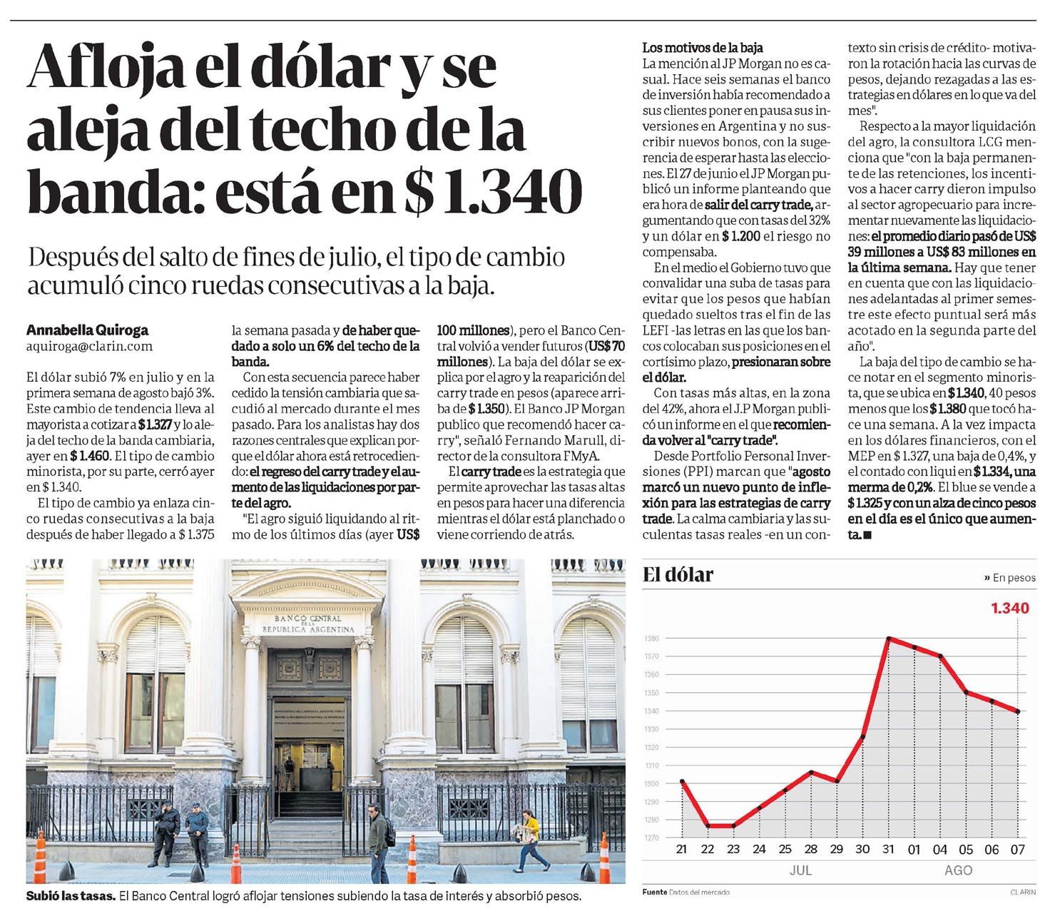 CLARÍN – Afloja el dólar y se aleja del techo de la banda: está en $ 1.340