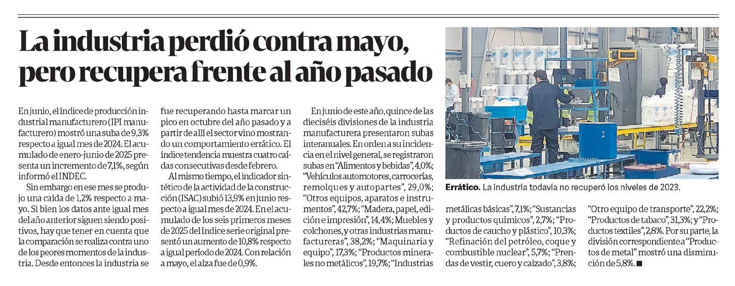 En junio, el índice de producción industrial manufacturero (IPI manufacturero) mostró una suba de 9,3% respecto a igual mes de 2024. El acumulado de enero-junio de 2025 presenta un incremento de 7,1%, según informó el INDEC.