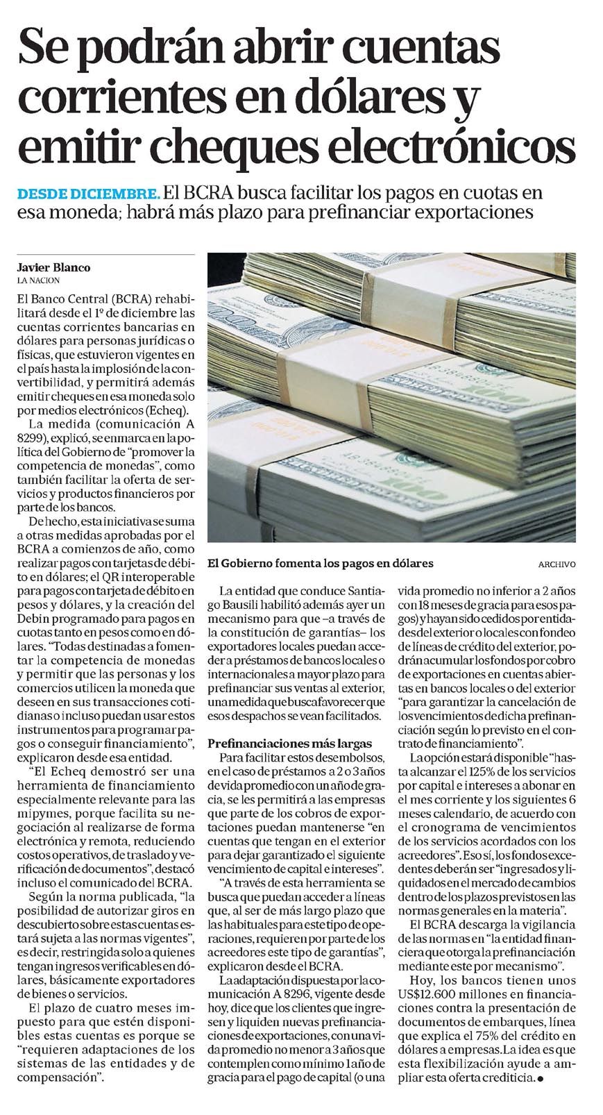 LA NACIÓN – Se podrán abrir cuentas corrientes en dólares y emitir cheques electrónicos