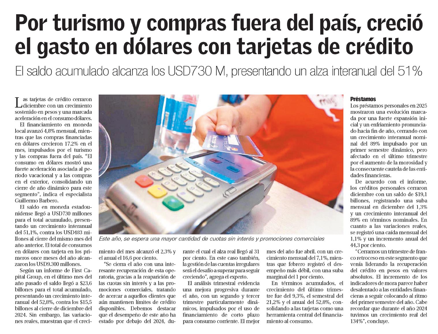 Las tarjetas de crédito cerraron diciembre con un crecimiento sostenido en pesos y una marcada aceleración en el consumo en dólares. El financiamiento en moneda local avanzó 4,8% mensual, mientras que las compras financiadas en dólares crecieron 17,2% en el mes, impulsados por el turismo y las compras fuera del país. "El consumo en dólares mostró una fuerte aceleración asociada al período vacacional y a las compras en el exterior, consolidando un cierre de año dinámico para este segmento", indica el especialista Guillermo Barbero.