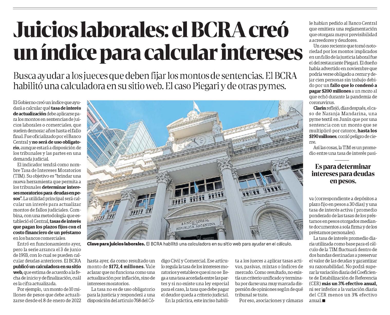 Busca ayudar a los jueces que deben fijar los montos de sentencias. El BCRA habilitó una calculadora en su sitio web. El caso Piegari y de otras pymes. El Gobierno creó un índice que ayudará a calcular qué tasa de interés y actualización debe aplicarse para los montos en sentencias de juicios laborales o comerciales, que suelen demorar años hasta el fallo final. Fue oficializado por el Banco Central y no será de uso obligatorio, aunque estará a disposición de los tribunales y las partes en una demanda judicial.