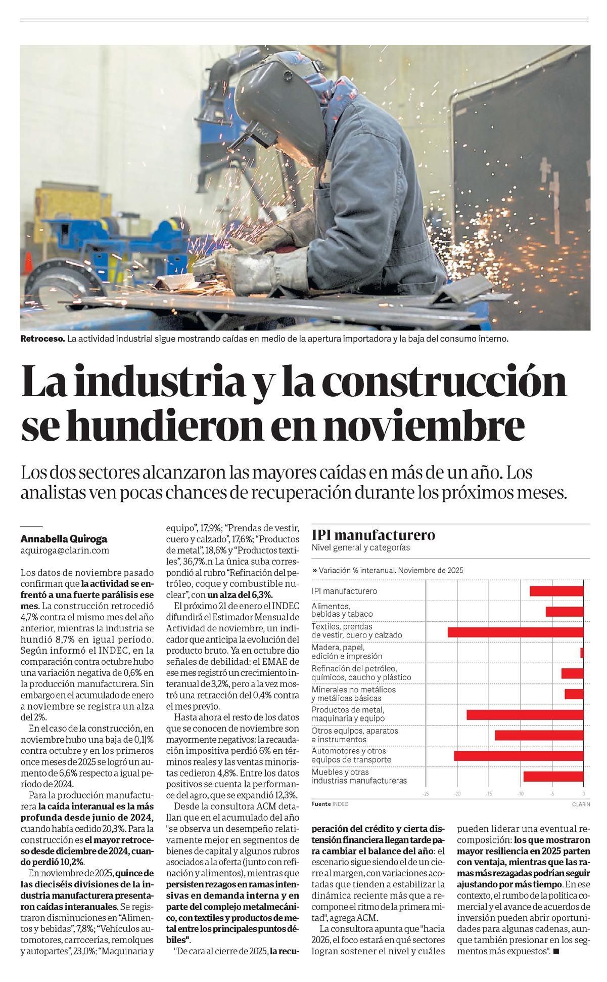 CLARÍN – La industria y la construcción se hundieron en noviembre