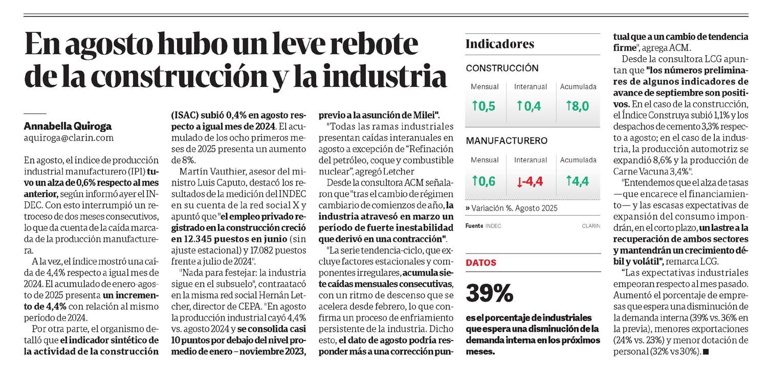 CLARÍN – En agosto hubo un leve rebote de la construcción y la industria