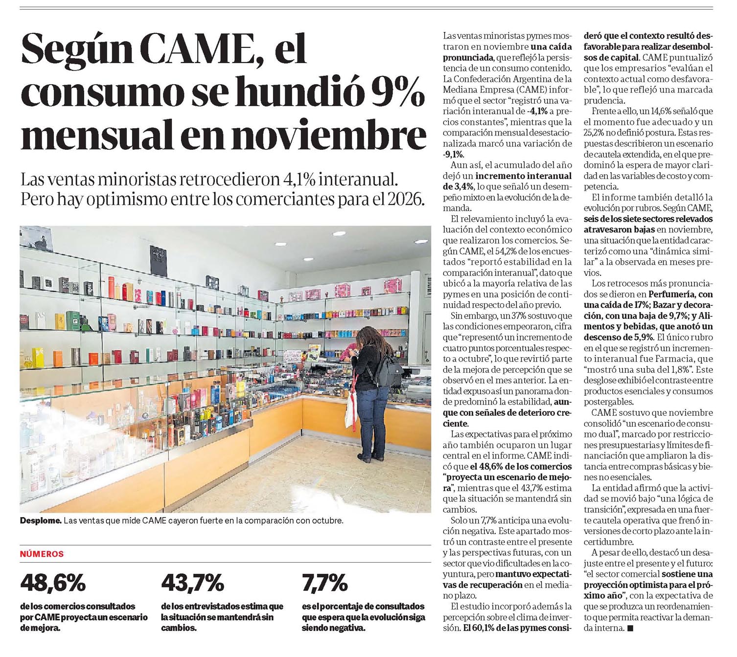 Las ventas minoristas retrocedieron 4,1% interanual. Pero hay optimismo entre los comerciantes para el 2026. Desplome. Las ventas que mide CAME cayeron fuerte en la comparación con octubre. Las ventas minoristas pymes mostraron en noviembre una caída pronunciada, que reflejó la persistencia de un consumo contenido.