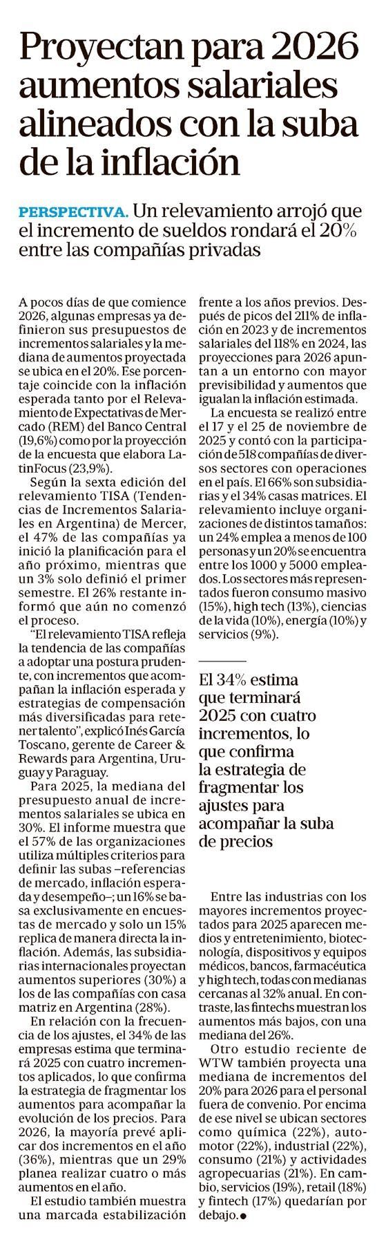 PERSPECTIVA. Un relevamiento arrojó que el incremento de sueldos rondará el 20% entre las compañías privadas. A pocos días de que comience 2026, algunas empresas ya definieron sus presupuestos de incrementos salariales y la mediana de aumentos proyectada ubica en el 20%.
