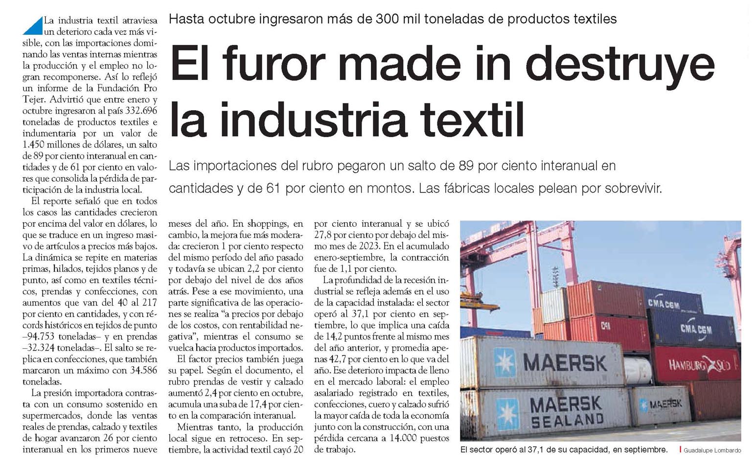 La industria textil atraviesa un deterioro cada vez más visible, con las importaciones dominando las ventas internas mientras la producción y el empleo no logran recomponerse. Así lo reflejó un informe de la Fundación Pro Tejer. Advirtió que entre enero y octubre ingresaron al país 332.696 toneladas de productos textiles y indumentaria por un valor de 1.450 millones de dólares, un salto del 89 por ciento interanual en cantidades y de 61 por ciento en valores que consolida la pérdida de participación de la industria local.