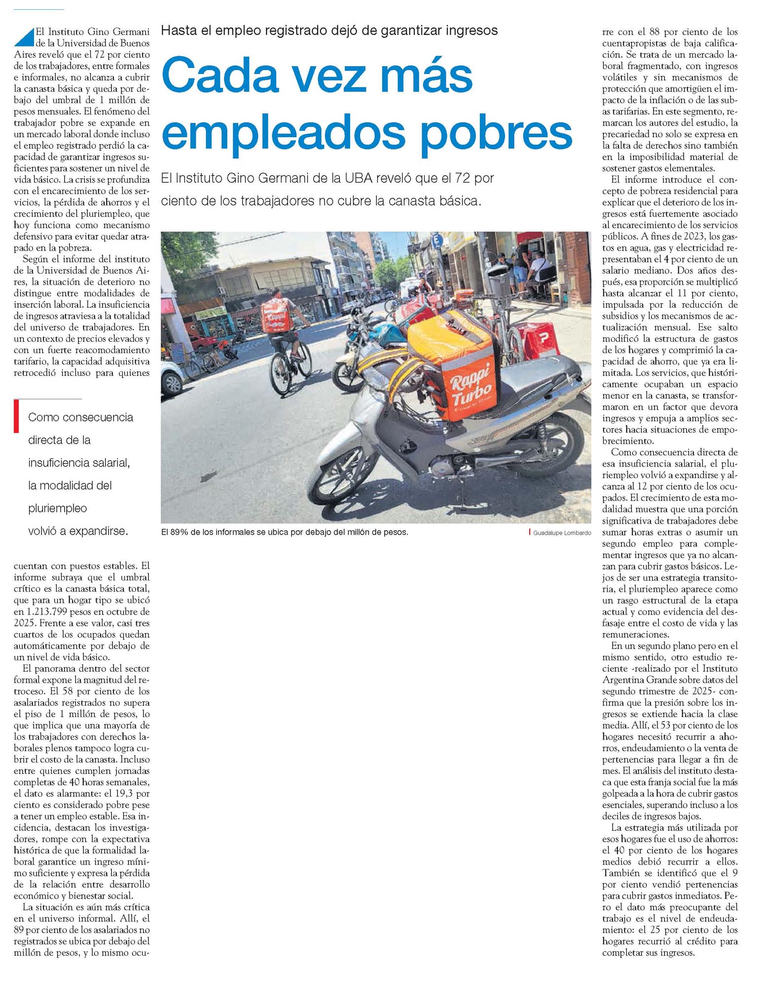 El Instituto Gino Germani de la Universidad de Buenos Aires reveló que el 72 por ciento de los trabajadores, entre formales e informales, no alcanza a cubrir la canasta básica y queda por debajo del umbral de 1 millón de pesos mensuales. El fenómeno de trabajador pobre se expande en un mercado laboral donde incluso el empleo registrado perdió la capacidad de garantizar ingresos suficientes para sostener un nivel de vida básico.