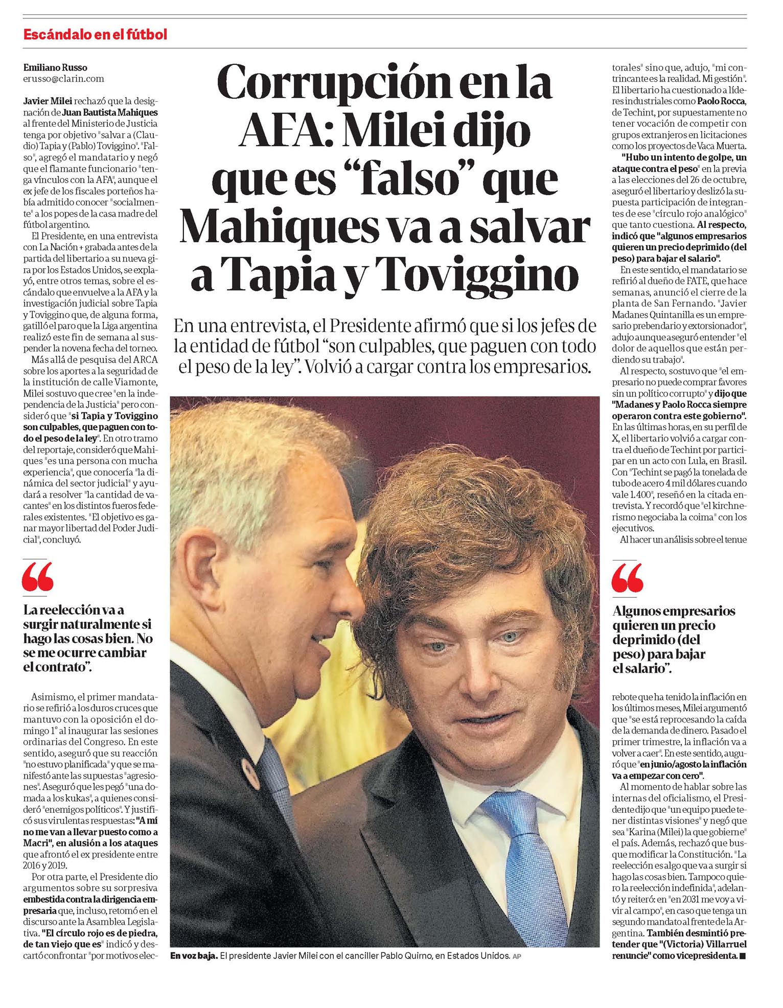 Javier Milei rechazó que la designación de Juan Bautista Mahiques al frente del Ministerio de Justicia tenga por objetivo "salvar a (Claudio) Tapia y (Pablo) Toviggino". "Falso", agregó el mandatario y negó que el flamante funcionario tenga vínculos con la AFA, aunque el exjefe de los fiscales porteños había admitido conocer "socialmente" a los popes de la casa madre del fútbol argentino.