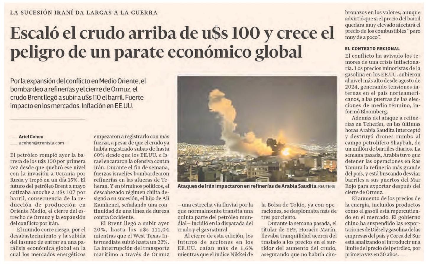 Por la expansión del conflicto en Medio Oriente, el bombardeo a refinerías y el cierre de Ormuz, el crudo Brent llegó a subir a u$s 110 el barril. Fuerte impacto en los mercados. Inflación en EE.uu