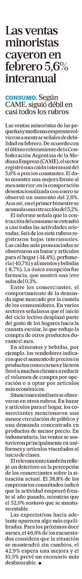 Las ventas minoristas de las pequeñas y medianas empresas volvieron a mostrar señales de debilidad en febrero. De acuerdo con el último relevamiento de la Confederación Argentina de la Mediana Empresa (CAME), el sector registró una caída interanual del 5,6% a precios constantes. El dato muestra una mejora frente al mes anterior: en la comparación desestacionalizada con enero se observó un aumento del 2,6%.